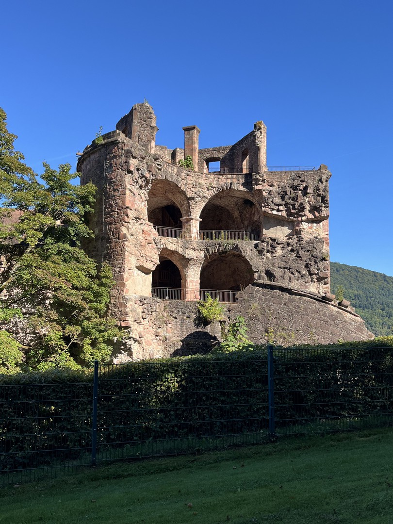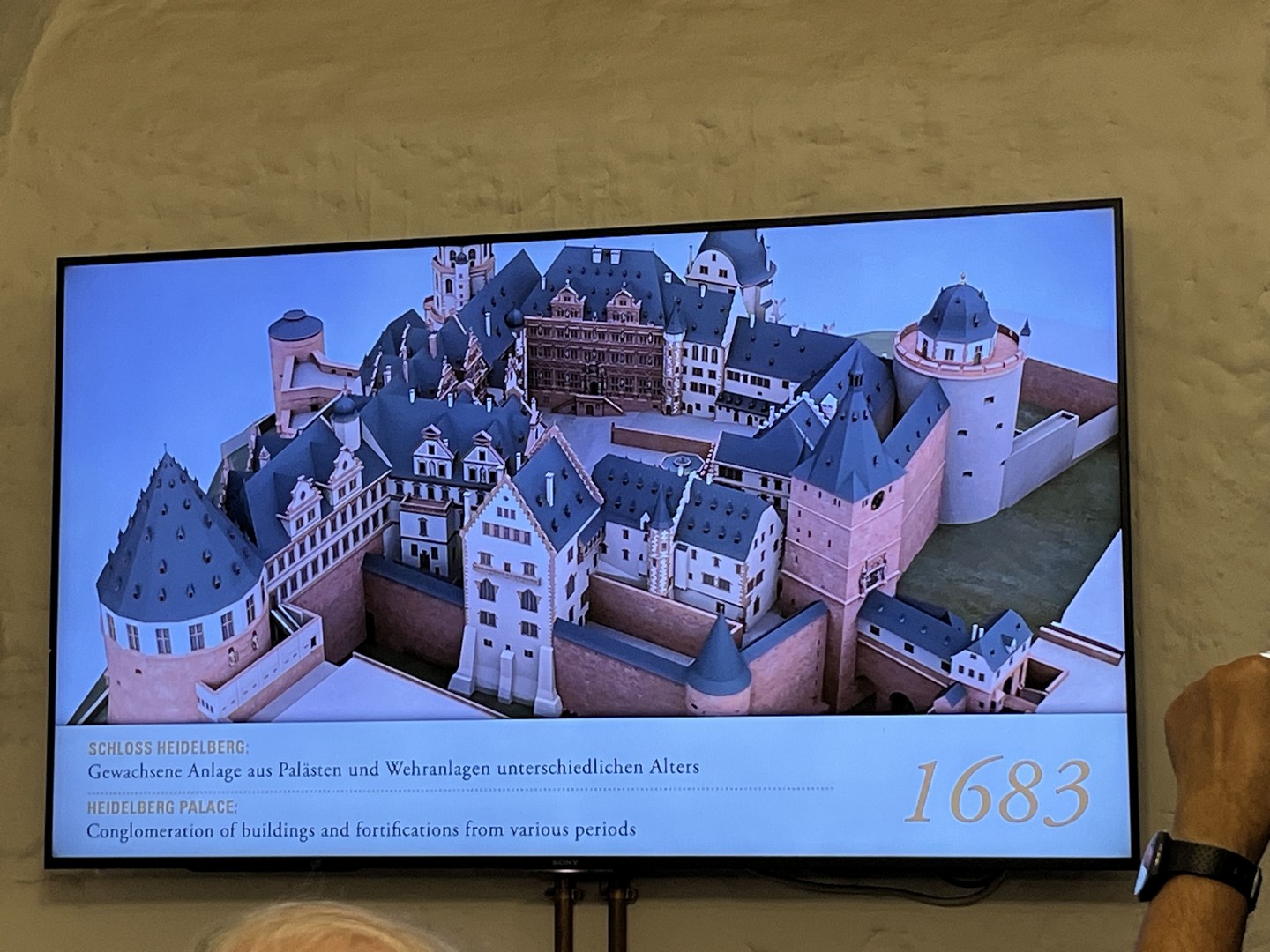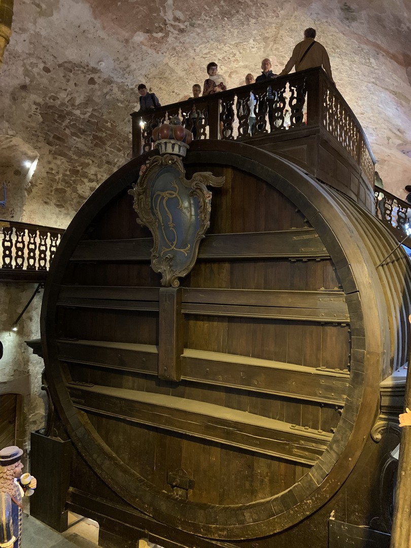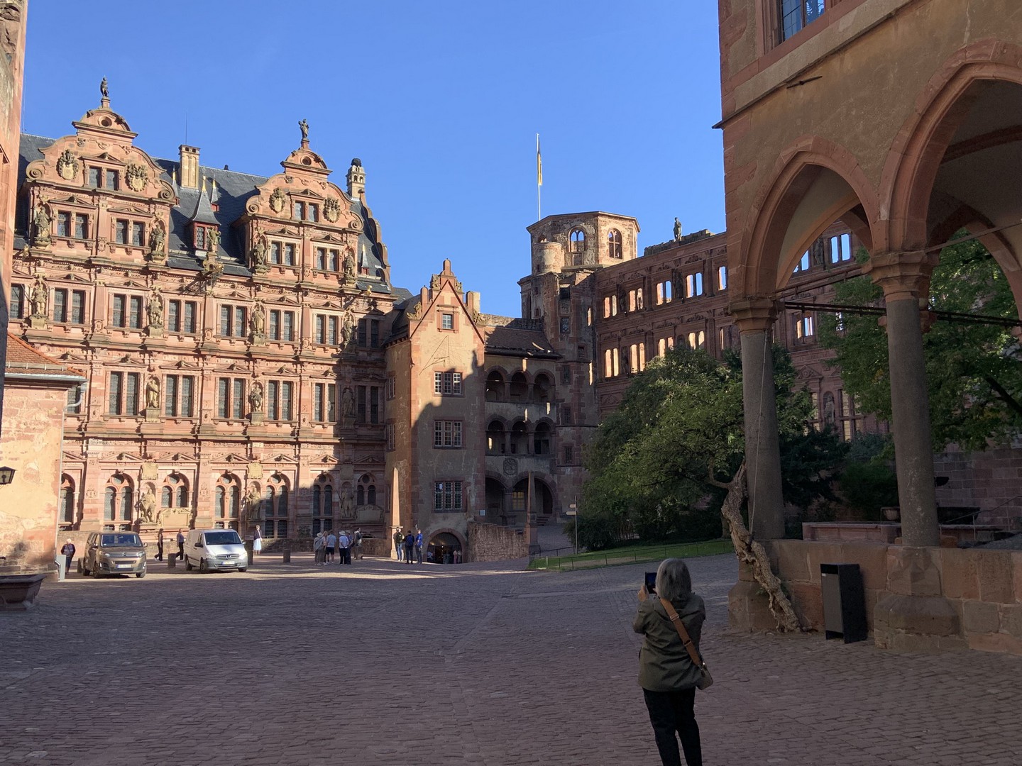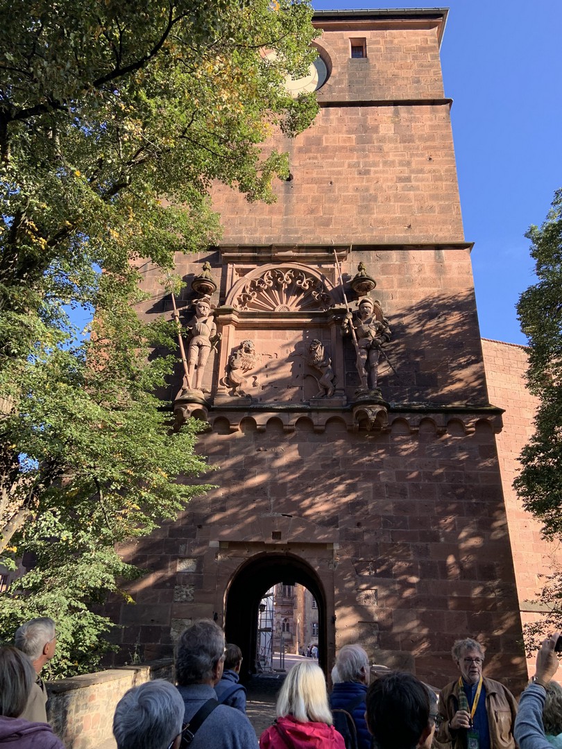 Pour ce deuxième jour, départ matinal pour éviter les embouteillages sur les sites à visiter. Direction le funiculaire pour rejoindre le château. Le Château de Heidelberg est situé sur un coteau surplombant la ville. Sa construction date du 13éme siècle. Sa façade principale est orientée vers le nord. Inséré entre deux collines, il contrôlait la vallée du Neckar, au centre de laquelle s'est construite la ville de Heidelberg. Visite en deux groupes de la partie extérieure du château, avec sa cour principale et ses jardins. On trouve, dans ces jardins, un buste de Goethe, par David d'Angers, offert par la France à la ville de Heidelberg. La visite se termine par une descente au caveau où trône l'impressionnant tonneau à vin ("Grosses Fass") de 228 000 litres. Une pompe permettait de tirer le vin à partir de la salle des banquets. Installé sous Charles Théodore à la fin du 18e siècle, le tonneau n'aurait été utilisé qu'à trois reprises.