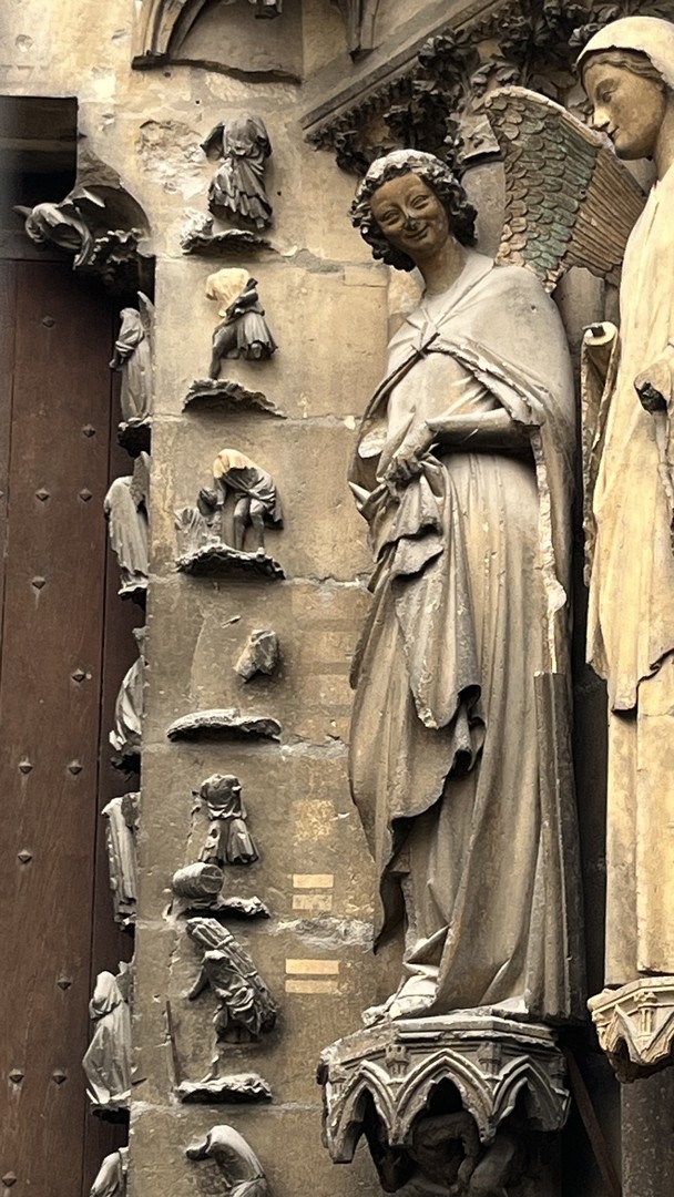Mais au-delà des grands personnages qui y ont trôné, la cathédrale Notre-Dame est un véritable chef-d’œuvre. C’est l’une des plus grandes et des plus lumineuses cathédrales de France et c’est également celle qui est ornée du plus grand nombre de statues au monde avec notamment la statue de Goliath, qui mesure plus de cinq mètres de haut (c'est la plus grande des statues de la façade). Il y a également la sculpture de l'ange bien connue avec le célèbre "sourire de l'ange" qui a une expression délicate et apaisante, incroyablement expressif et énigmatique presque humain. Après les descriptions de la façade nous pénétrons à l’intérieur de l'édifice.